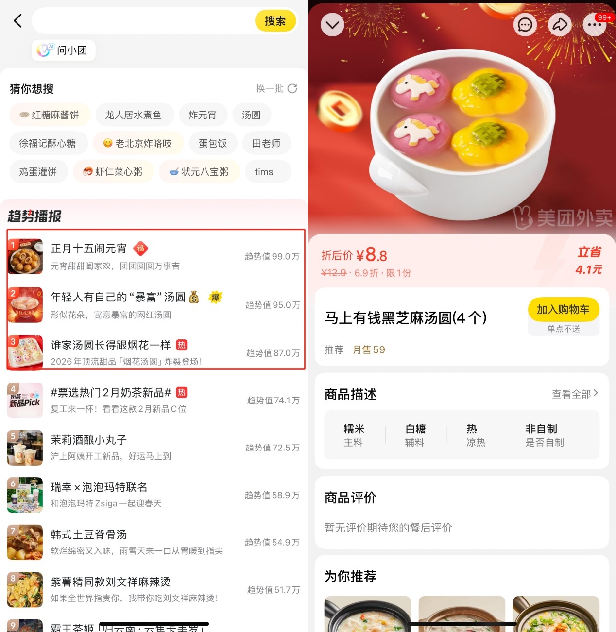 元宵节当天,美团外卖趋势热搜榜单中,前三均为汤圆相关元素。图源:美团App