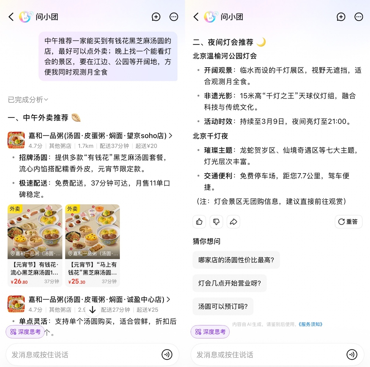 即便是工作日,也要吃到“有钱花汤圆”,还要赏月和逛灯会。元宵前夕,近5万人将难题抛给“小团”AI,输入类似“中午推荐一家能买到有钱花黑芝麻汤圆的店,最好可以点外卖;晚上找一个能看灯会的景区,要在江边、公园等开阔地,方便我同时观测月全食”等复杂问题。据美团数据,最近一周用户询问“小团”元宵等相关问题的次数提升了21倍。
