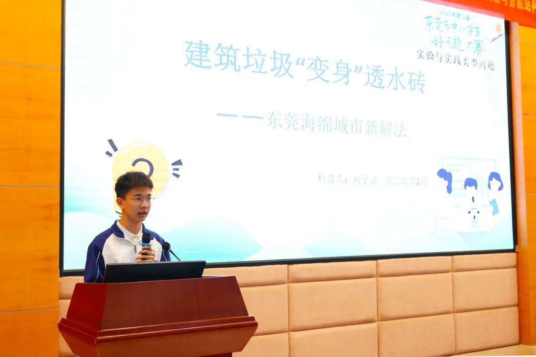 齐朗同学研究的“好问题”是《以技术重写规则——如何拯救发动机的“呼吸之殇”》。阙子涵同学研究的“好问题”是《建筑垃圾“变身”透水砖——东莞海绵城市新解法》。在东莞中学这片孕育梦想的沃土上,总有一群少年以好奇心为帆,以钻研精神为桨,在科技创新的海洋中乘风破浪。