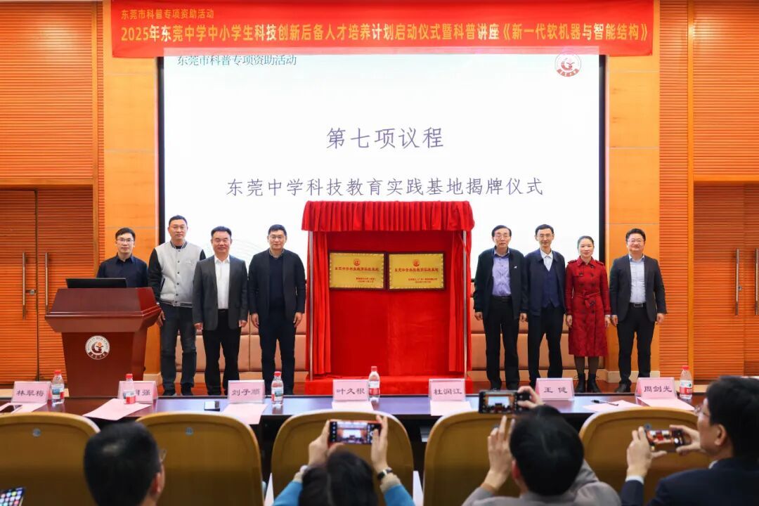 杜润江副局长、叶久根副主席、刘子顺副校长、叶建强副馆长、陈月强主任、林翠梅副总经理、王健书记、周剑光校长等领导、嘉宾上台共同为东莞中学科技教育实践基地揭牌,并正式启动本次“培养计划”,全场师生共同见证东莞中学教育历程中又一重要时刻。
