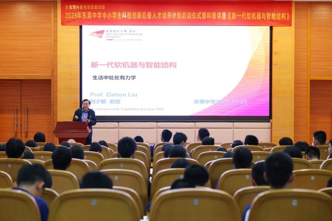 香港城市大学(东莞)副校长刘子顺教授带来《新一代软机器与智能结构》主题讲座,将大学前沿课题带入中学课堂,引燃学子探索热情。同步开设的校内科普展廊,将深奥科学原理化为生动展示,进一步拓展了学生的科技视野。