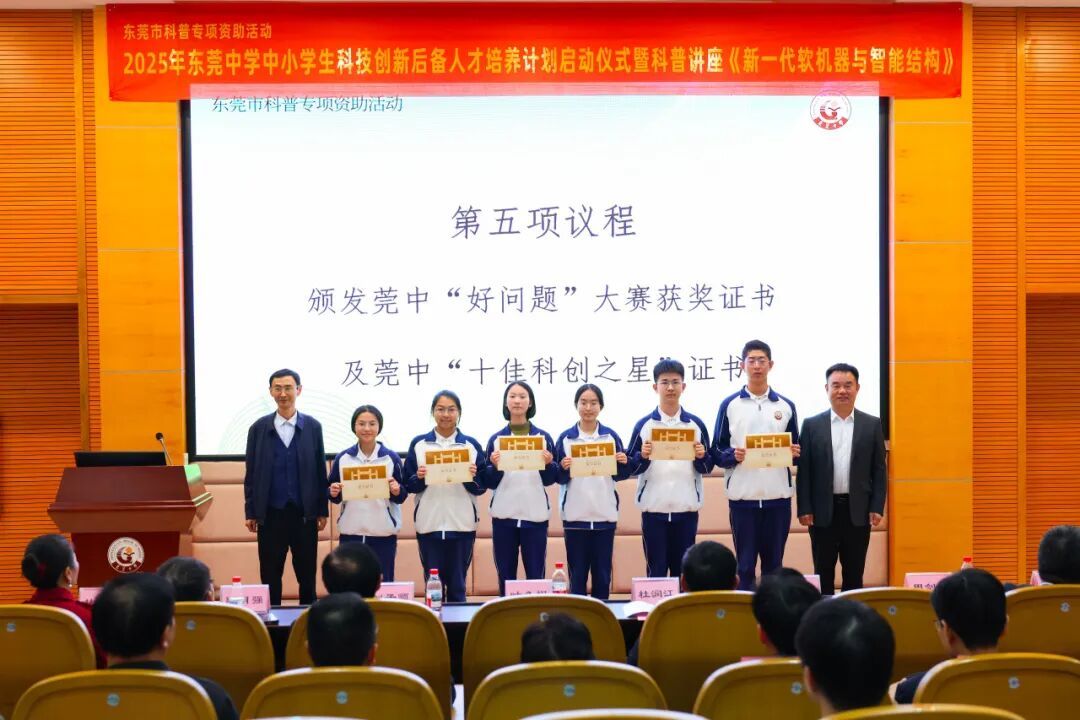 叶久根副主席、王健书记为“好问题”大赛获奖同学、东莞中学2024-2025学年高中“十佳科创之星”同学颁奖,激励更多学子勇攀科学高峰。