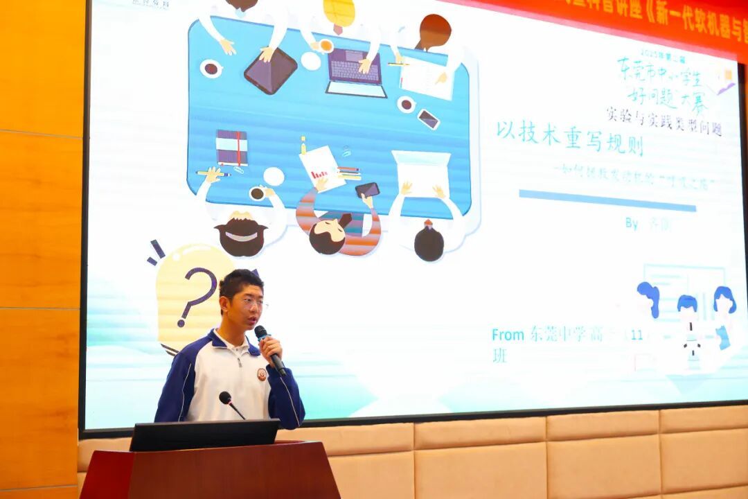 在东莞市第二届中小学生“好问题”大赛中,我校有6个作品强势入围(高中组共42个复赛名额)。高一镜堂3班齐朗、高二镜堂2班阙子涵两名同学作为优秀代表上台分享了他们的“好问题”。