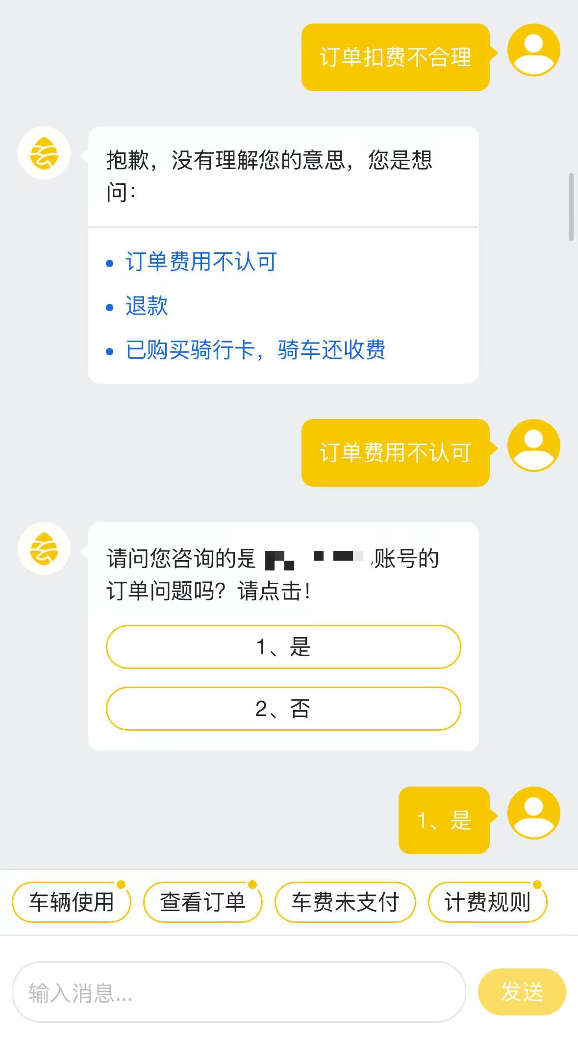 邱先生向记者发来求助,邱先生认为,此次扣费不合理在于,车辆停放后长时间处于静止状态,“平台后台完全可监测到骑行已终止,仍按全程时长计费不合理。”更让他不满的是,自己多次在小程序提交诉求、拨打官方客服电话,均只有机器人回复,无法联系到人工客服,维权渠道不畅。
